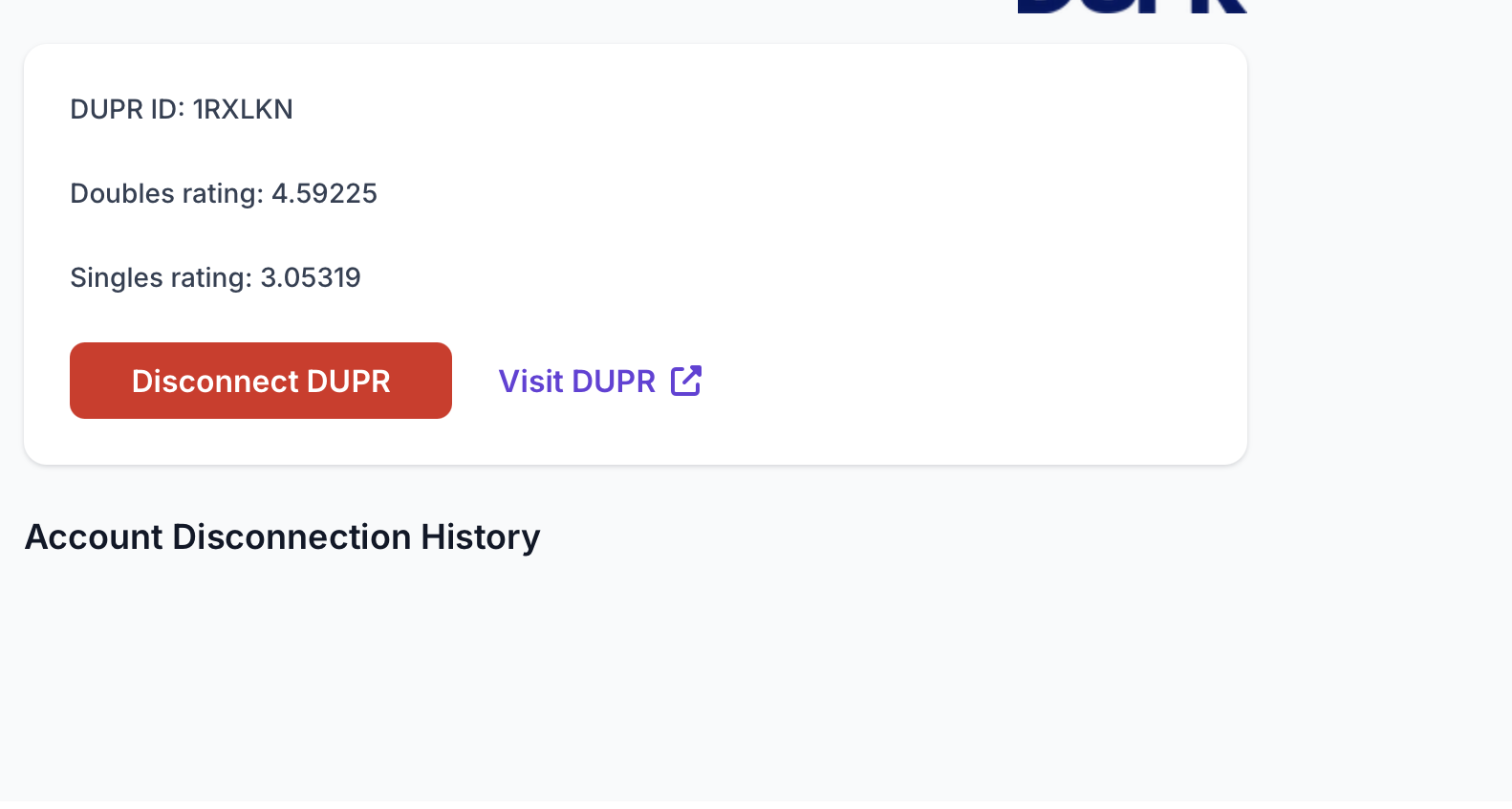 ** Please note: You can disconnect your DUPR only ONE time. After that, you must contact support (support@pickleball.com) to request your DUPR account be disconnected along with the reason why. Your disconnection history will be shown below your DUPR to easily keep track of it.