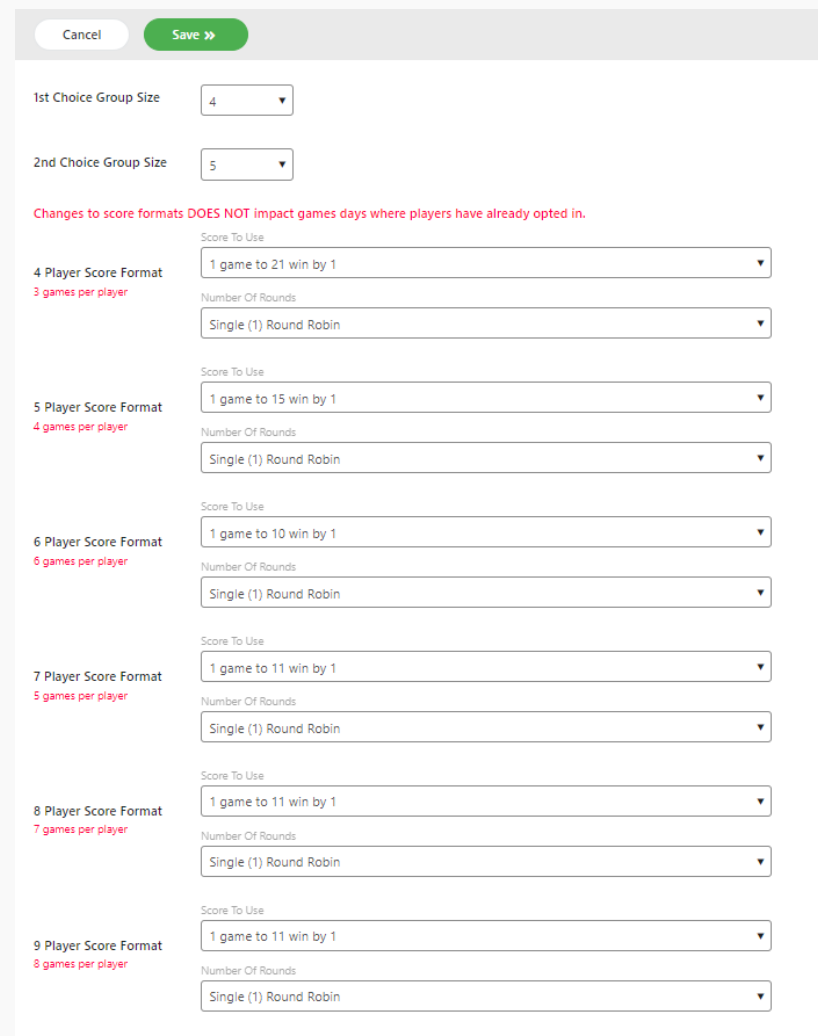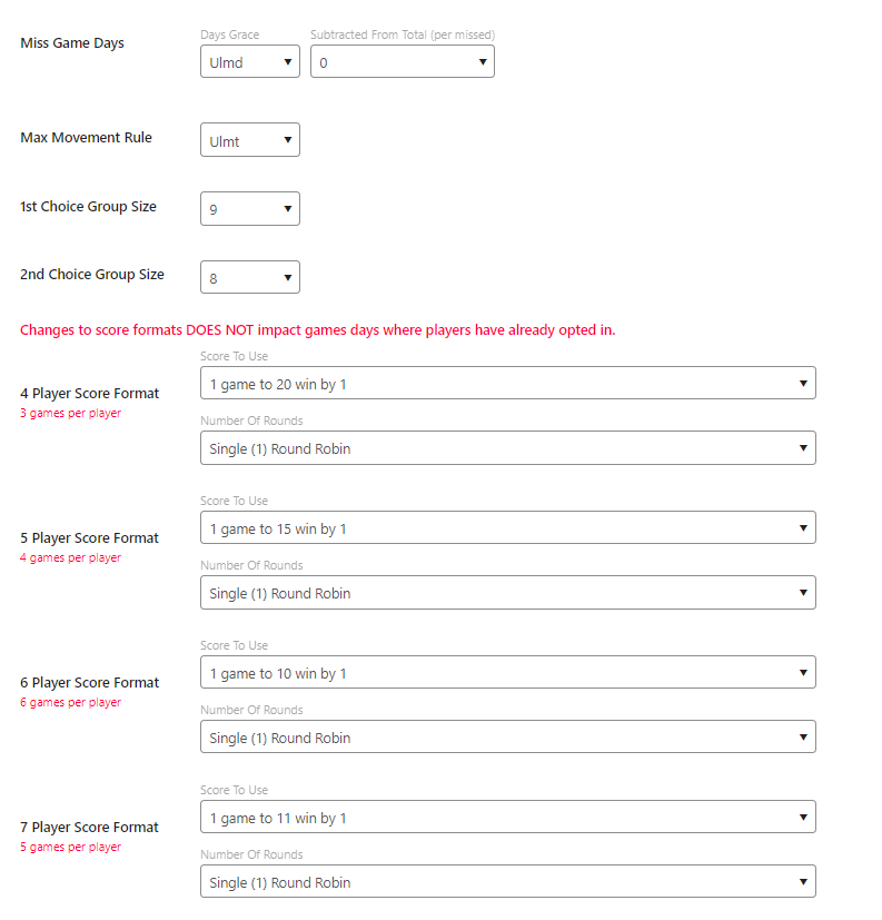 You have the ability here to specify the first and second size group size that you prefer for the session and the game format for each possible group size. All of these choices will depend on the number of courts that you have available and the maximum number of opt ins you permit for each game day. The system will always use a format that includes every opted in player. It will first attempt to use your preferred group size settings.