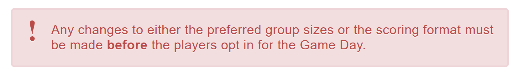 Groups are configured each Game Day based on the number of players who have opted in. The League must specify, in advance, the preferred group sizes and the default scoring format for each size group. Groups can be configured for up to 9 players for a single or double round.