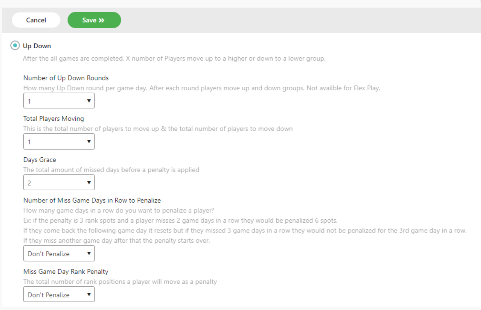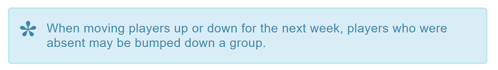 - After all games are played top X number of players move up a group and the bottom X number of players move down. Players are reseeded based on their movement and ready for the next game day