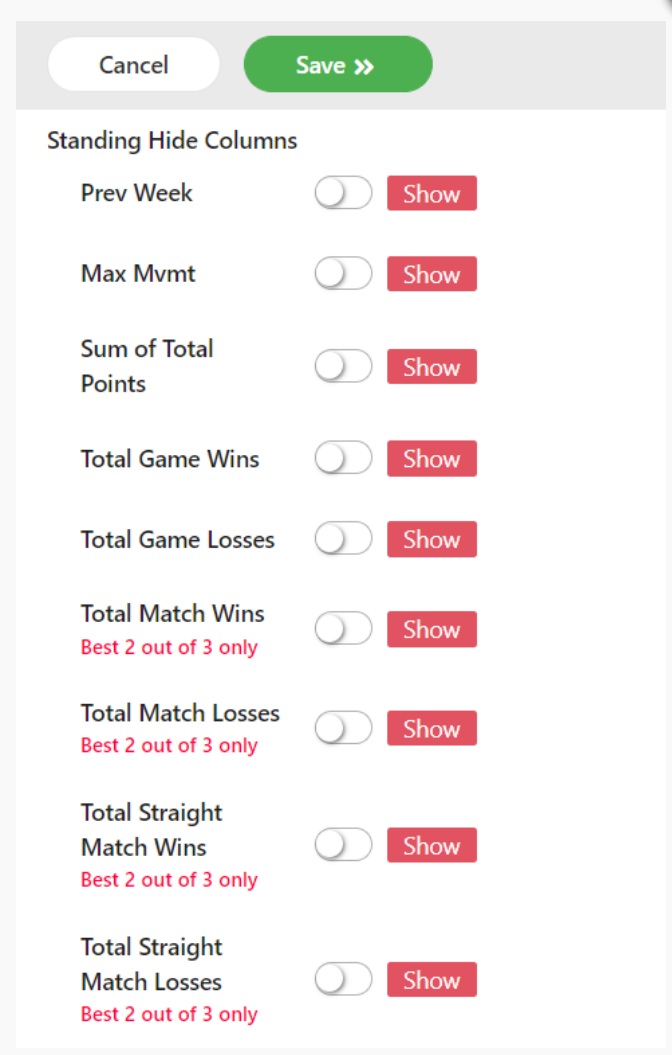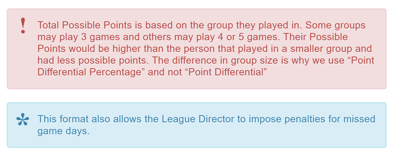 - Total game wins for that game day (or round if you are doing a double round robin format)