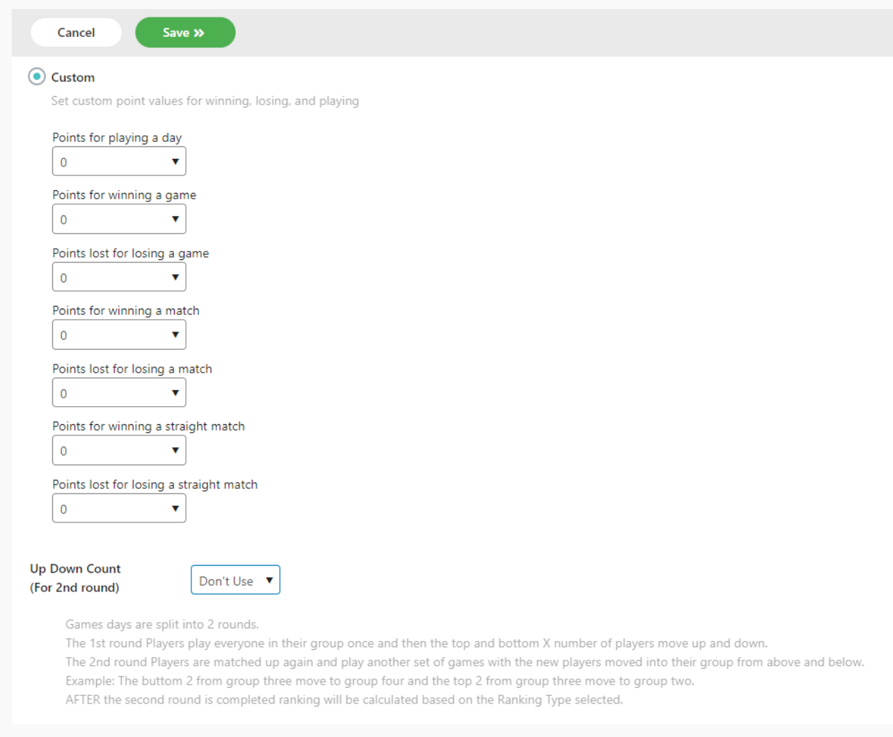 Custom Leagues allow the League Director to award points based on performance each game day. Total points accumulated are then used to rank players on the ladder.