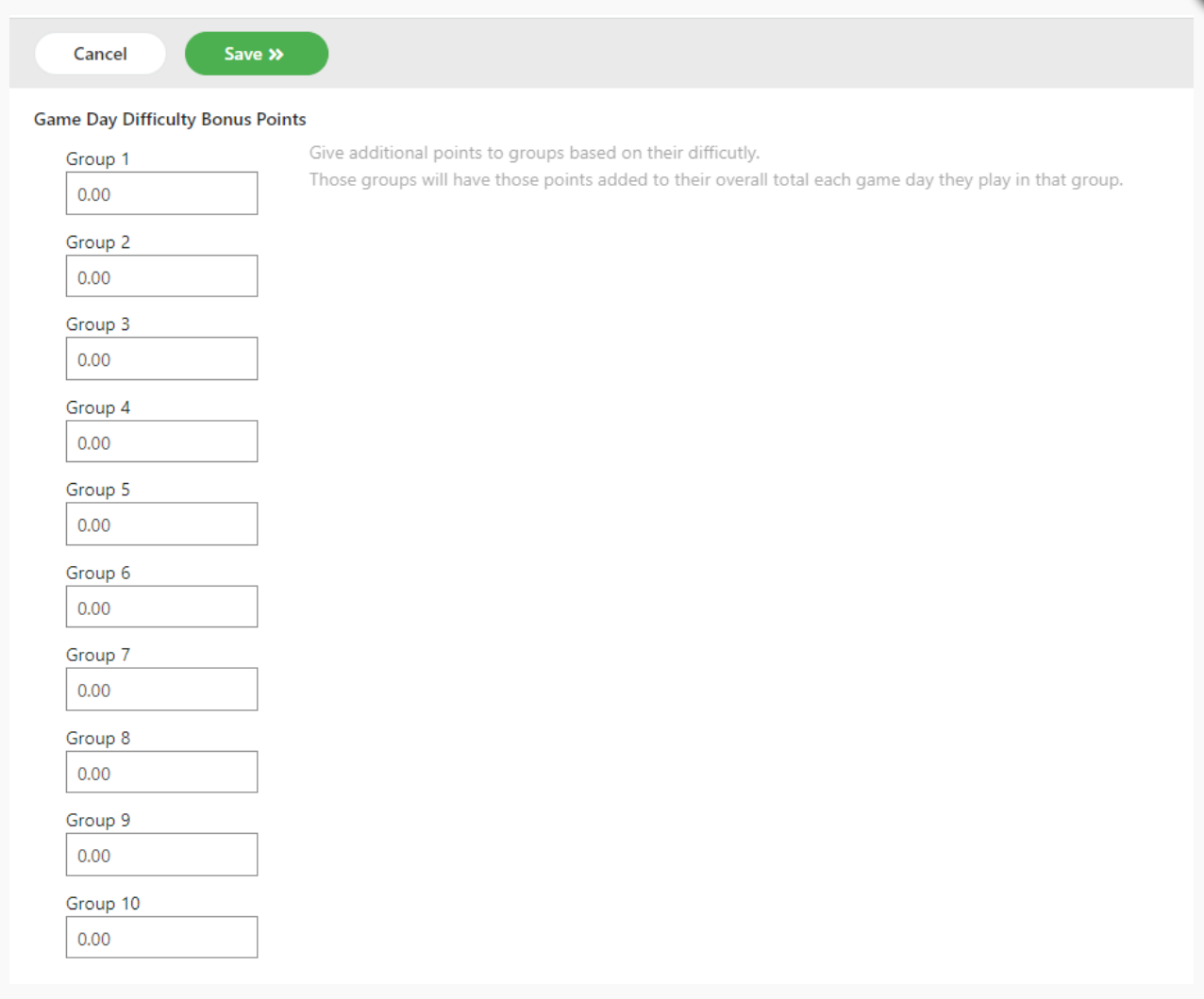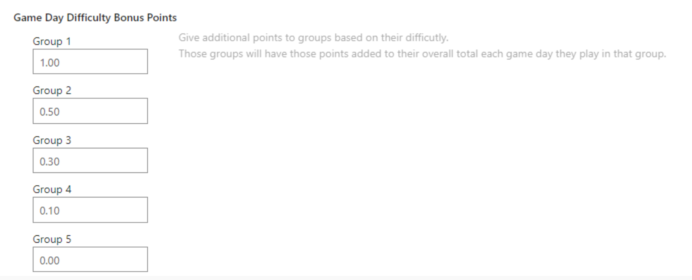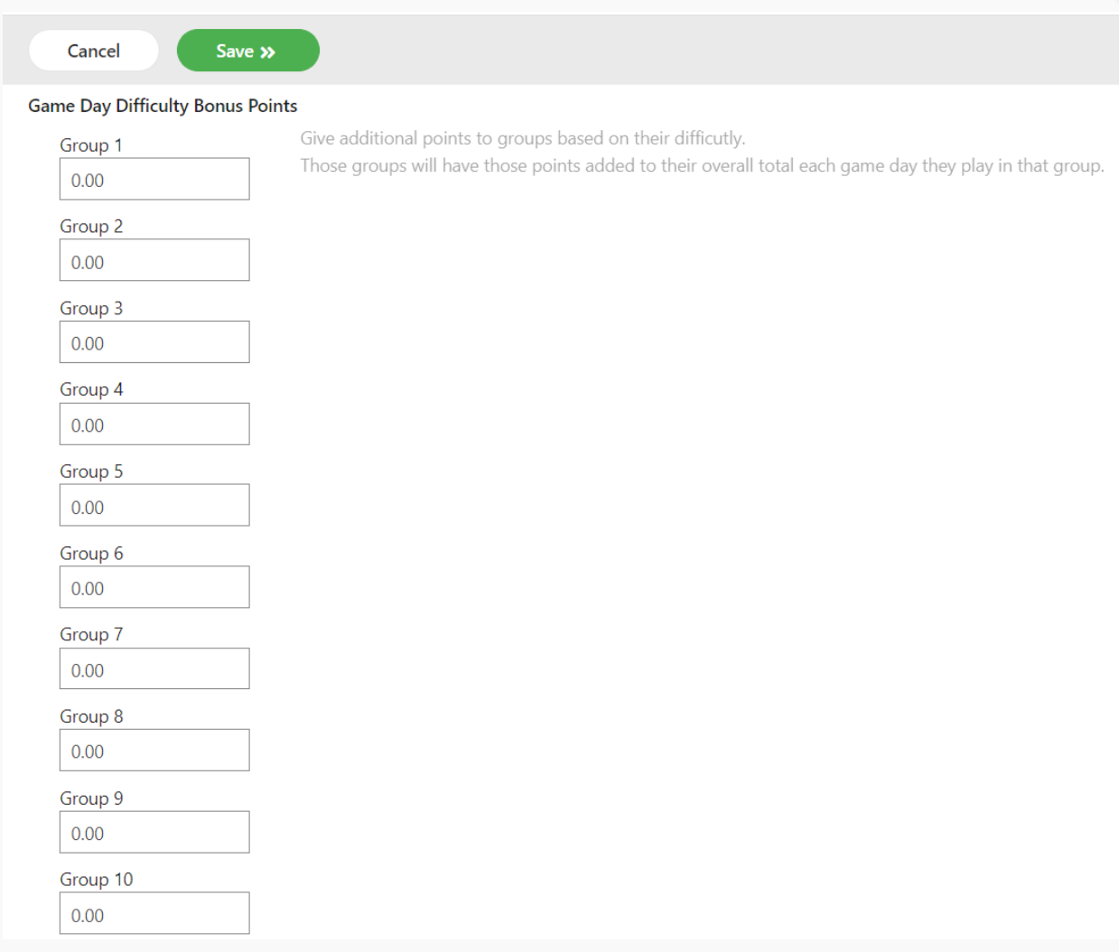 The League Director can award bonus points to players in a group based on the difficulty of play. Those points are added to the Custom score after all calculations take place. Points can be entered up to two decimal places.