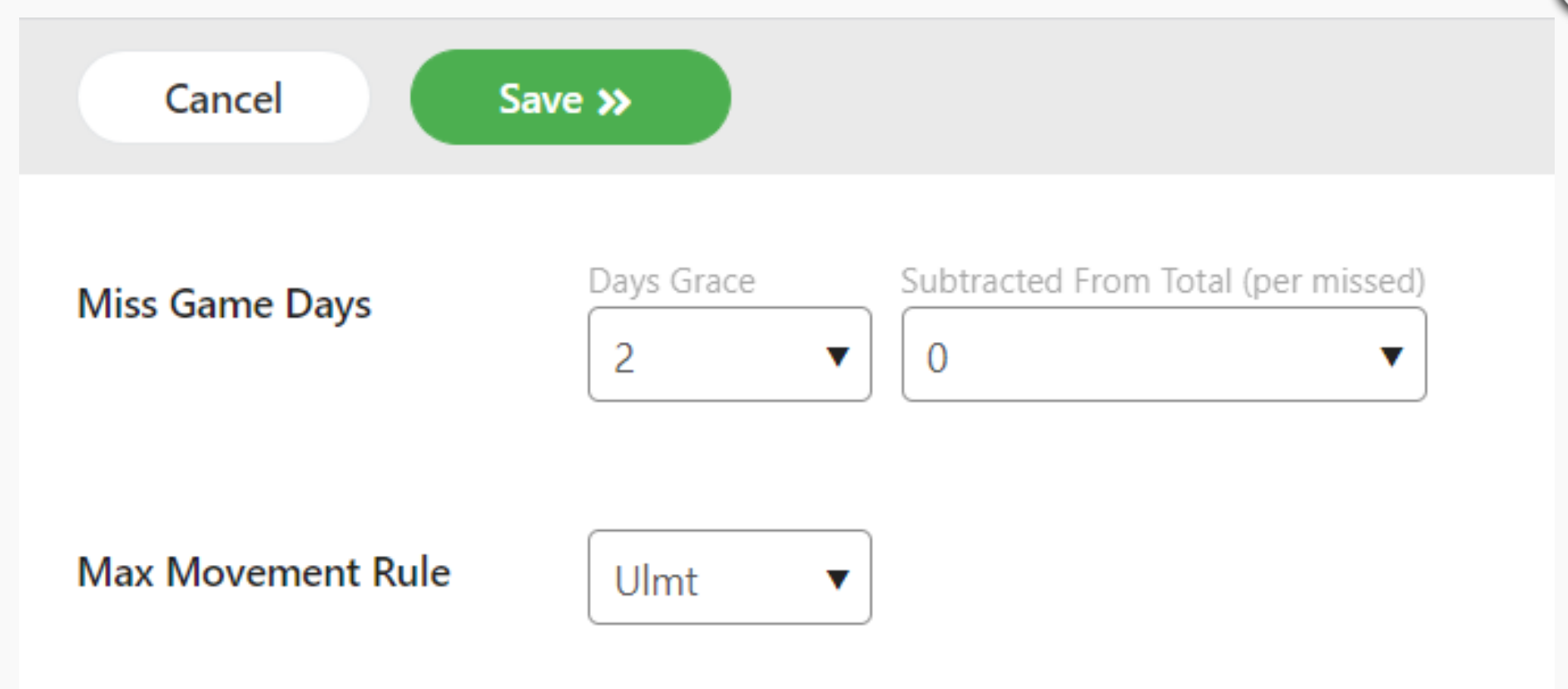 - Apply penalties for missed game days by first selecting the grace period (how many consecutive days can be missed without a penalty) and then selecting the penalty to be applied for subsequent missed game days. That penalty will be subtracted from the total points.