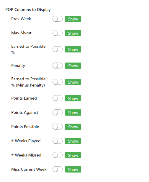 For a Custom league setup, be sure to show the relevant columns on the ladder page. If the league has penalties or up/down limits that affect the ladder rankings, be sure to show those columns.
